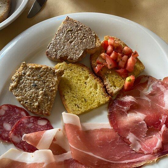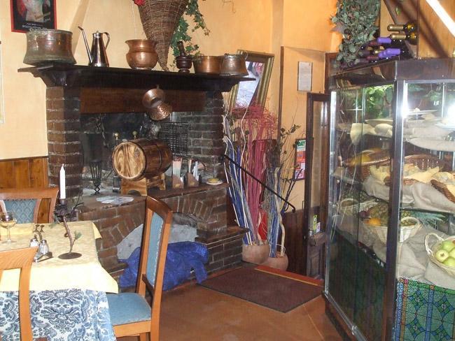 Pizza e piatti umbri serviti tra rivestimenti di legno e mattoni a vista in un ampio locale rétro con camino.